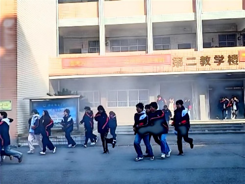 本次演练模拟了校园第二教学楼与综合楼因电路超负荷引发火灾的突发场景。上午10时30分,烟雾弥漫,警报响起。在发现模拟险情后,相关教师迅速上报,学校政教处立即启动应急预案。各楼层疏导人员迅速到位,组织引导学生用湿毛巾捂住口鼻,按照预定疏散路线,通过四个消防通道有序撤离。整个疏散过程紧张有序,仅用时2分58秒,教学楼内的2412名师生全部安全撤离至指定集合区域。