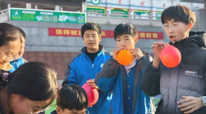 在“雕塑艺术家”环节,同学们用身体动作定格近期状态,并主动分享内心感受,学会表达与倾听。“鲤鱼跃龙门”活动则象征着携手共赴成长挑战,大家在互助配合中体会到坚持与合作的意义。随后的“压力退散符”将气氛推向高潮——学生将当下的烦恼写在气球上,通过彼此分享获得鼓励与建议,最后亲手将气球挤破,寓意告别焦虑、轻装前行。