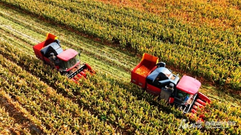 2024年9月初,新疆维吾尔自治区昌吉回族自治州呼图壁县制种玉米迎来丰收。2024年,新疆粮食生产能力实现大幅提升,全年粮食单产达524.8公斤每亩,比全国平均水平高130公斤,历史上首次排名全国第一。(呼图壁县融媒体中心供图)