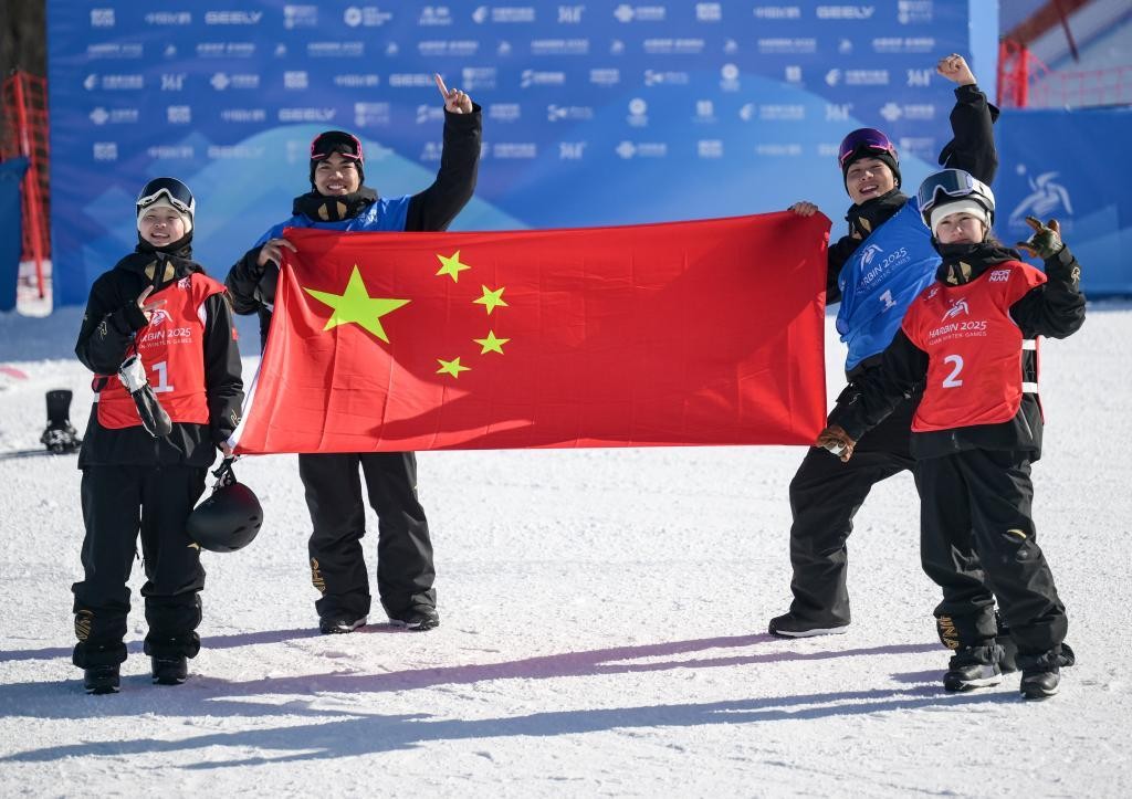 2月10日,中国选手张小楠、杨文龙、姜鑫杰与熊诗芮(从左至右)在比赛后庆祝。当日,在亚布力举行的第九届亚冬会单板滑雪女子大跳台决赛中,中国选手熊诗芮夺冠,张小楠获得亚军;在男子大跳台决赛中,中国选手杨文龙夺冠,姜鑫杰获得亚军。新华社记者 牟宇 摄
