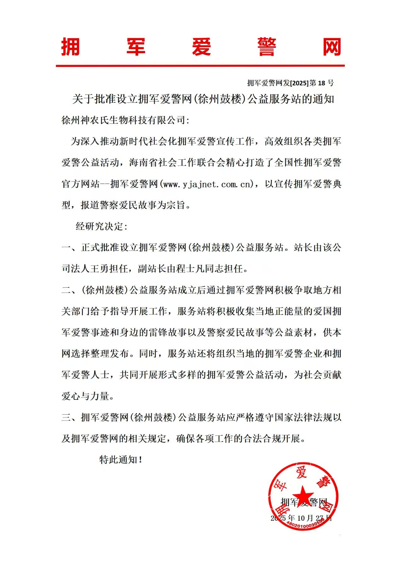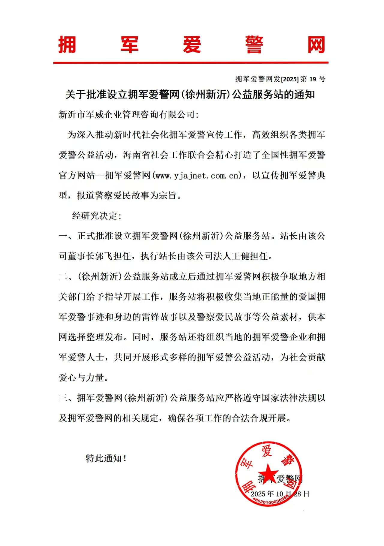 2025年10月27日,拥军爱警网下发[2025]第19号文件,正式批准设立拥军爱警网(徐州新沂)公益服务站。 站长由江苏省