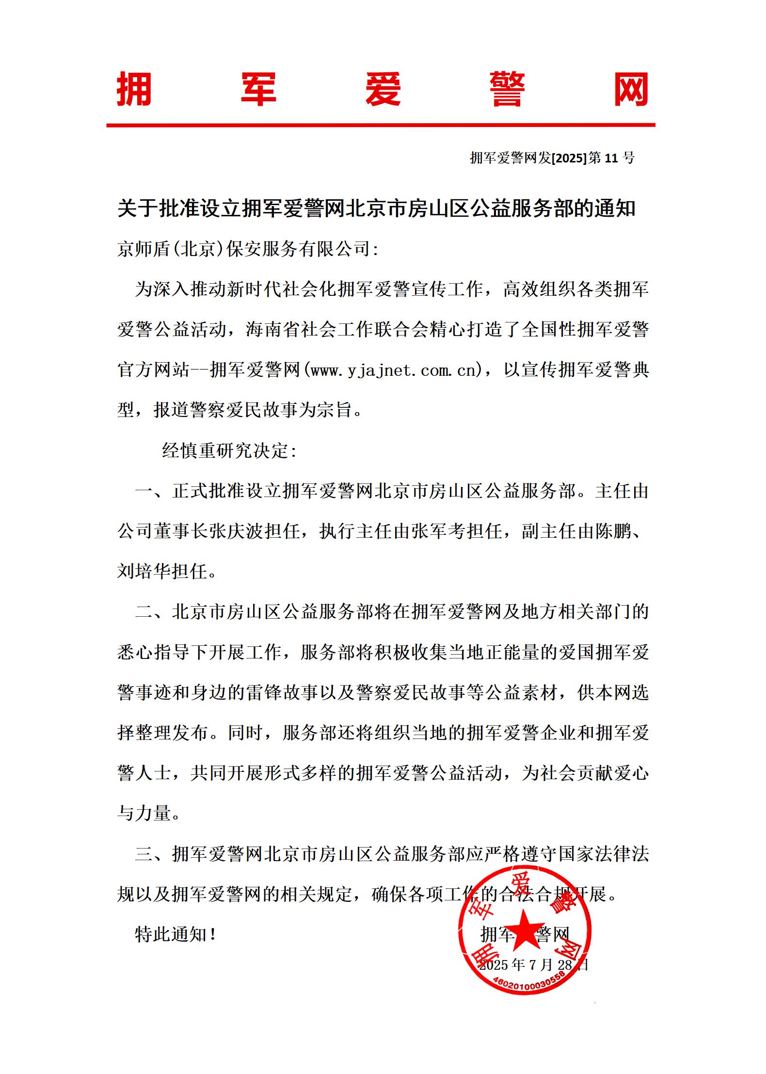 拥军爱警网北京市房山区公益服务部批准成立