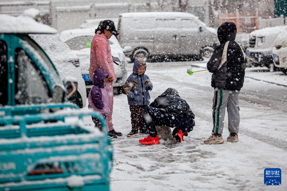 3月2日,小朋友在山东省淄博市高青县一居民区雪地上玩耍。 受寒潮影响,3月2日起,山东大部分地区出现雨雪降温