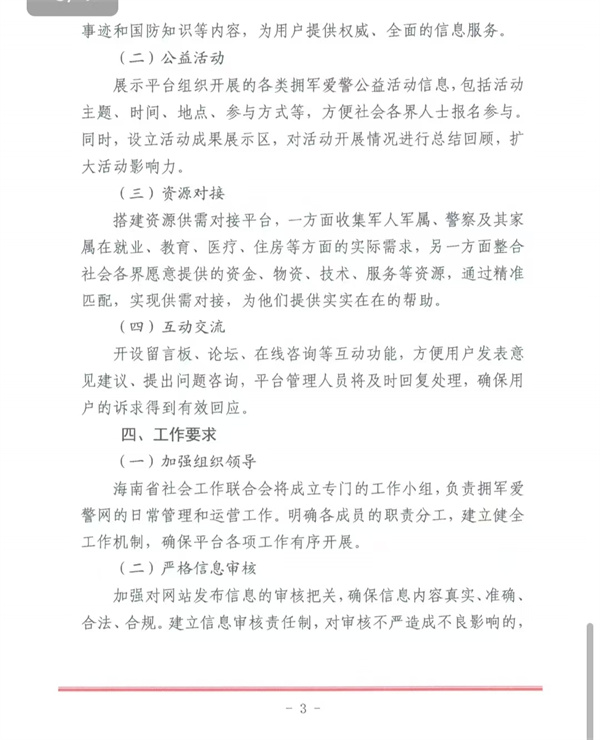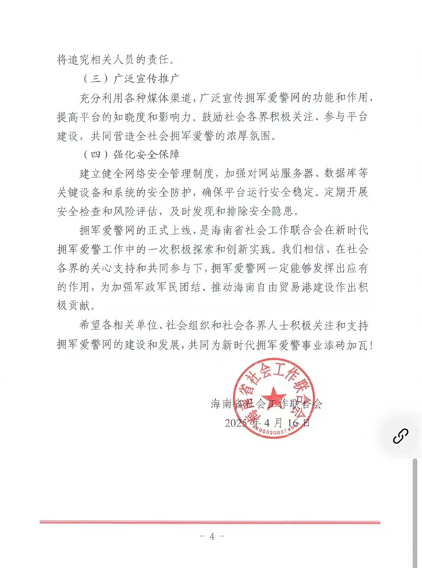 此外,海南省社会工作联合会主管主办的拥军爱警网,由海南省海洋安全救援部承办。拥军爱警网的正式上线,是海南省社会工作联合会在新时代拥军爱警工作中的一次积极探索和创新实践。