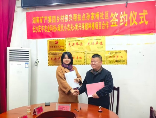 2月8日,新邵县潭溪镇孙家桥社区与长沙庆午农业科技公司正式签署黄兴辣椒种植项目合作协议,标志着由湖南矿产集团新龙矿业乡村振兴驻村工作队推动的这一特色产业项目进入实质性建设阶段。该项目创新采用“村、企、农”合作模式,以“软硬兼施”的系统化建设路径,探索出一条可复制、可持续的乡村产业振兴新实践。新龙矿业乡村振兴驻村工作队队长、第一书记汪洋,孙家桥社区党总支书记石文军,长沙庆午农业总经理吴国勤等出席签约仪式。
