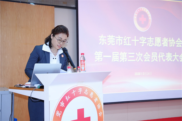 本网讯(吴静 王小玲) 3月28日,东莞市红十字志愿者协会第一届第三次会员代表大会、第三次理(监)事会在南城世纪城集团总部9楼召开。全体会员代表齐聚一堂,回顾2025年工作成果,共商2026年发展大计,凝心聚力,笃定前行,为东莞红十字志愿服务事业高质量发展擘画新蓝图。我会会长牛凤梅,监事长范祖全,副会长林洁莹、高伟、叶慧坚、张冬莲等出席会议。会议由副会长林洁莹主持。