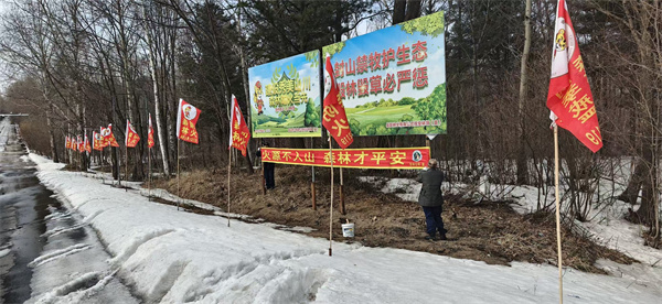 林场坚持“预防为主”方针,多措并举开展森林防火宣传。在G331国道沿线、重点林区入口设置主题宣传展板,悬挂“火源不入山 森林才平安”“封山禁牧护生态 毁林毁草必严惩”等醒目横幅;在镇区街道、办公区域、林区道路两侧插放森林防火旗帜,形成全域覆盖的宣传声势。通过直观醒目的宣传载体,广泛普及防火知识,切实提升林区群众防火意识,从源头降低火灾风险。