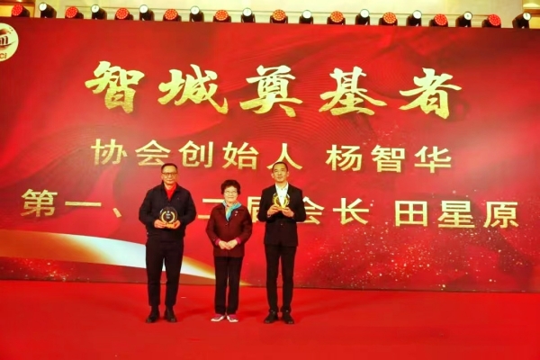 庆典活动举行了隆重的智城奠基者颁发纪念牌仪式。为表彰协会创始人杨智华和第一、第二届会长 田星原为协会发展做出的卓越贡献,大会特别向他们颁发"智城奠基者"纪念牌,感谢他们十年来的无私奉献和辛勤耕耘。