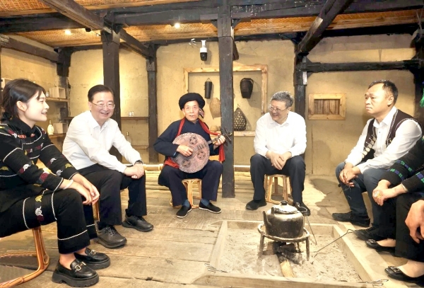 △ 4月17日,上海市代表团在元阳县阿者科村了解村民生产生活、旅游促增收及哈尼古歌传承等情况。